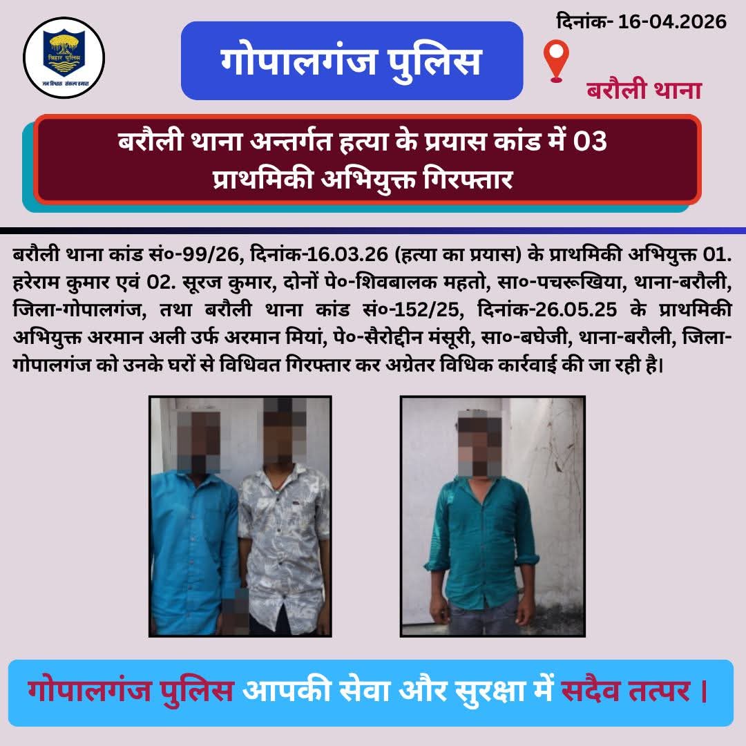 गोपालगंज: बरौली पुलिस की बड़ी कार्रवाई, हत्या के प्रयास मामले में 03 अभियुक्त गिरफ्तार।