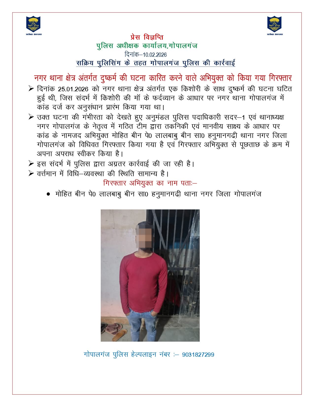 गोपालगंज पुलिस की बड़ी कार्रवाई: नाबालिग से दुष्कर्म का आरोपी गिरफ्तार, पुलिस के सामने कबूला जुर्म।