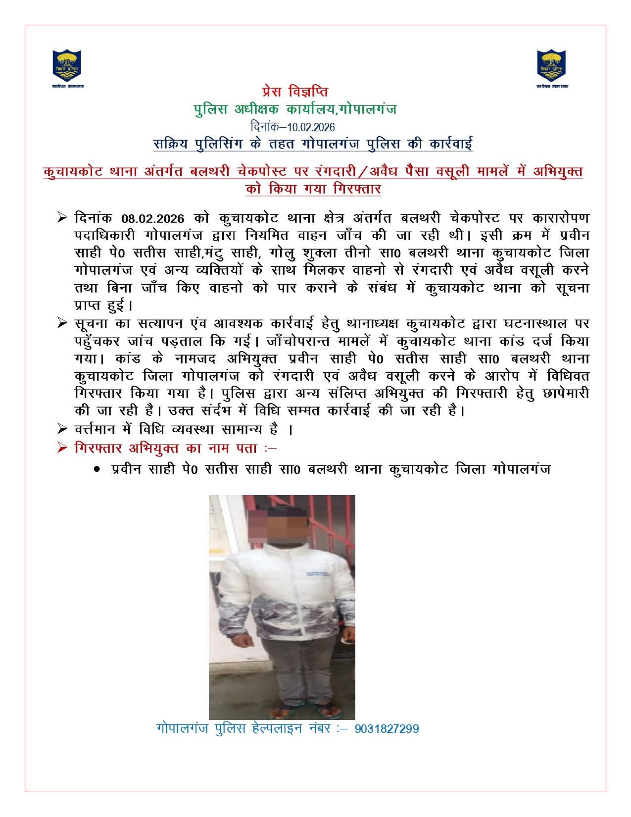 गोपालगंज।। जिला पुलिस ने सक्रिय पुलिसिंग और अपराधियों के खिलाफ जीरो टॉलरेंस की नीति को दोहराते हुए कुचायकोट थाना क्षेत्र में एक महत्वपूर्ण सफलता हासिल की है। पुलिस ने बलथरी चेकपोस्ट पर वाहनों से अवैध वसूली और रंगदारी करने के मामले में एक मुख्य अभियुक्त को गिरफ्तार किया है।मिली जानकारी के अनुसार, बीते 8 फरवरी 2026 को बलथरी चेकपोस्ट पर तैनात कराधान पदाधिकारियों द्वारा वाहनों की नियमित जांच की जा रही थी। इसी दौरान पुलिस को सूचना मिली कि प्रवीण साही (पिता सतीस साही) अपने साथियों—मंटू साही, गोलू शुक्ला और अन्य के साथ मिलकर वाहनों को बिना जांच के पास कराने और उनसे जबरन रंगदारी वसूलने का खेल खेल रहा है।सूचना मिलते ही कुचायकोट थानाध्यक्ष ने दलबल के साथ घटनास्थल पर पहुंचकर मामले की छानबीन की। जांच में आरोपों की पुष्टि होने के बाद तत्काल मामला दर्ज किया गया। पुलिस ने त्वरित कार्रवाई करते हुए नामजद अभियुक्त प्रवीण साही, पिता – सतीस साही, ग्राम- बलथरी, थाना- कुचायकोट, जिला- गोपालगंज को गिरफ्तार कर लिया है। पुलिस प्रशासन ने स्पष्ट किया है कि इस गिरोह में शामिल अन्य अभियुक्तों की गिरफ्तारी के लिए लगातार छापेमारी की जा रही है। वर्तमान में क्षेत्र में कानून-व्यवस्था सामान्य है और पुलिस किसी भी प्रकार की अवैध वसूली को बर्दाश्त नहीं करने के मूड में है।