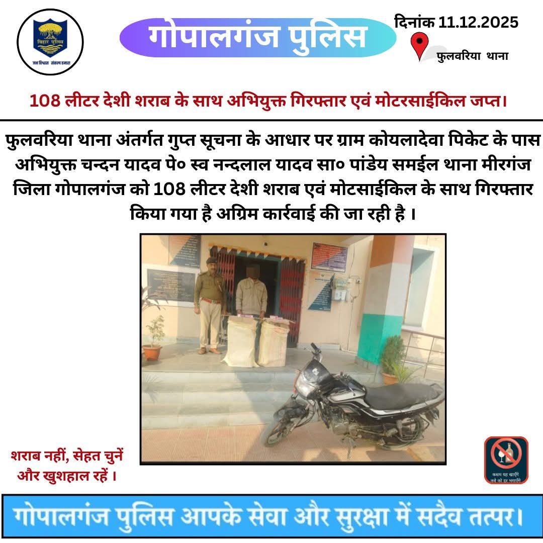 गोपालगंज पुलिस की बड़ी कार्रवाई: 108 लीटर देसी शराब के साथ तस्कर गिरफ्तार, मोटरसाइकिल भी जब्त