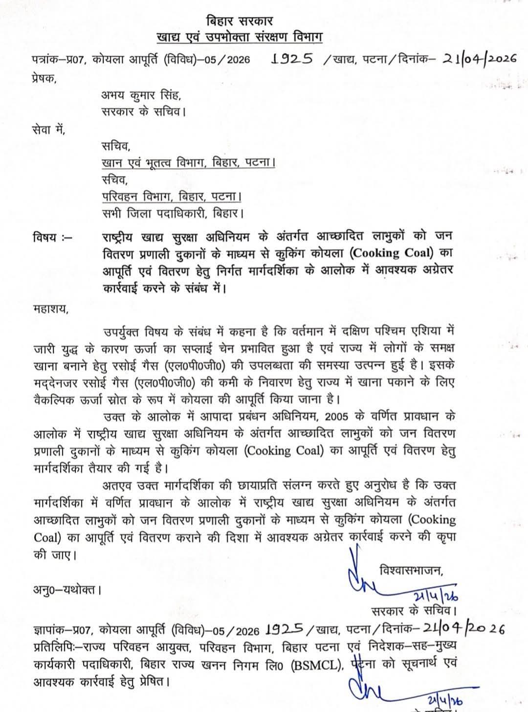 गोपालगंज ।। बिहार में रसोई गैस (LPG) की किल्लत से जूझ रहे आम लोगों के लिए राज्य सरकार ने एक महत्वपूर्ण कदम उठाया है। अब राज्य के राशन कार्ड धारकों को जन वितरण प्रणाली (PDS) की दुकानों के माध्यम से कुकिंग कोयला (Cooking Coal) उपलब्ध कराया जाएगा। खाद्य एवं उपभोक्ता संरक्षण विभाग के सचिव अभय कुमार सिंह द्वारा जारी आधिकारिक पत्र के अनुसार, दक्षिण पश्चिम एशिया में चल रहे युद्ध के कारण वैश्विक ऊर्जा सप्लाई चेन बुरी तरह प्रभावित हुई है। इसका सीधा असर रसोई गैस की उपलब्धता पर पड़ा है। गैस की कमी को देखते हुए राज्य सरकार ने वैकल्पिक ऊर्जा स्रोत के रूप में कोयले की आपूर्ति करने का निर्णय लिया है। सरकार के इस फैसले का लाभ मुख्य रूप से उन लोगों को मिलेगा जो राष्ट्रीय खाद्य सुरक्षा अधिनियम (NFSA) के अंतर्गत आच्छादित हैं। जिनके पास वैध राशन कार्ड है और वे राशन दुकानों से जुड़े हैं। इस योजना को अमलीजामा पहनाने के लिए सरकार ने आपदा प्रबंधन अधिनियम, 2005 के प्रावधानों का सहारा लिया है। विभाग ने इसके लिए विस्तृत मार्गदर्शिका (Guidelines) तैयार कर ली है। राज्य के सभी जिला पदाधिकारियों (DM), खान एवं भूतत्व विभाग और परिवहन विभाग को इस संबंध में आवश्यक कार्रवाई करने के निर्देश जारी कर दिए गए हैं। बिहार राज्य खनन निगम लिमिटेड (BSMCL) और परिवहन विभाग मिलकर कोयले की निर्बाध आपूर्ति सुनिश्चित करेंगे। सरकार के इस कदम से उन गरीब परिवारों को बड़ी राहत मिलने की उम्मीद है जिन्हें गैस सिलेंडर के दामों में बढ़ोतरी या उसकी अनुपलब्धता के कारण चूल्हा जलाने में परेशानी हो रही थी।