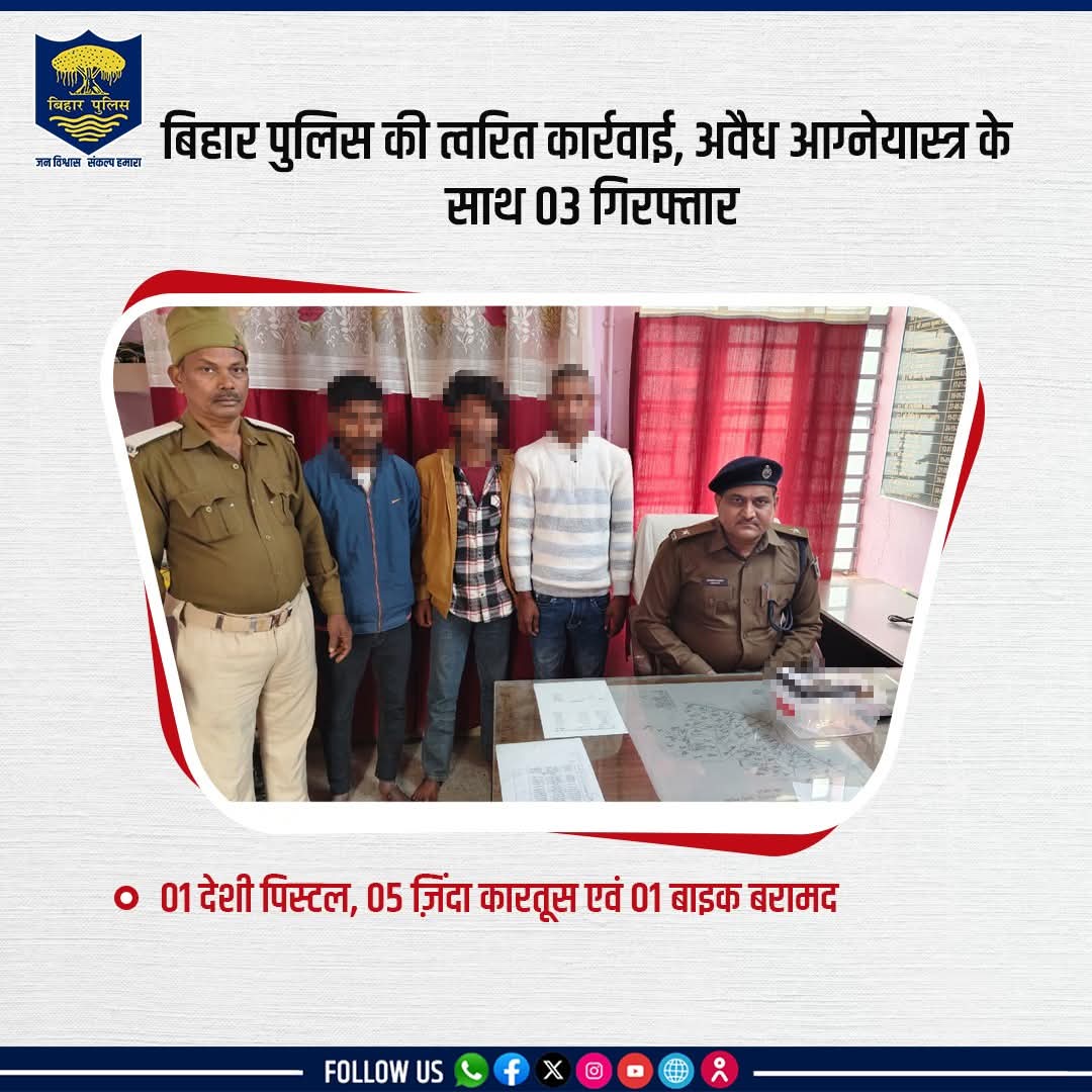 मोतिहारी, 6 दिसंबर 2025 – मोतिहारी के मधुबन थाना अंतर्गत पीरमुहल्ला में पुलिस ने बड़ी कार्रवाई की है। पुलिस ने 3 व्यक्तियों को अवैध आग्नेयास्त्र के साथ गिरफ्तार किया है। इनके पास से 1 देशी पिस्टल, 5 जिंदा कारतूस और 1 बाइक जब्त की गई है।