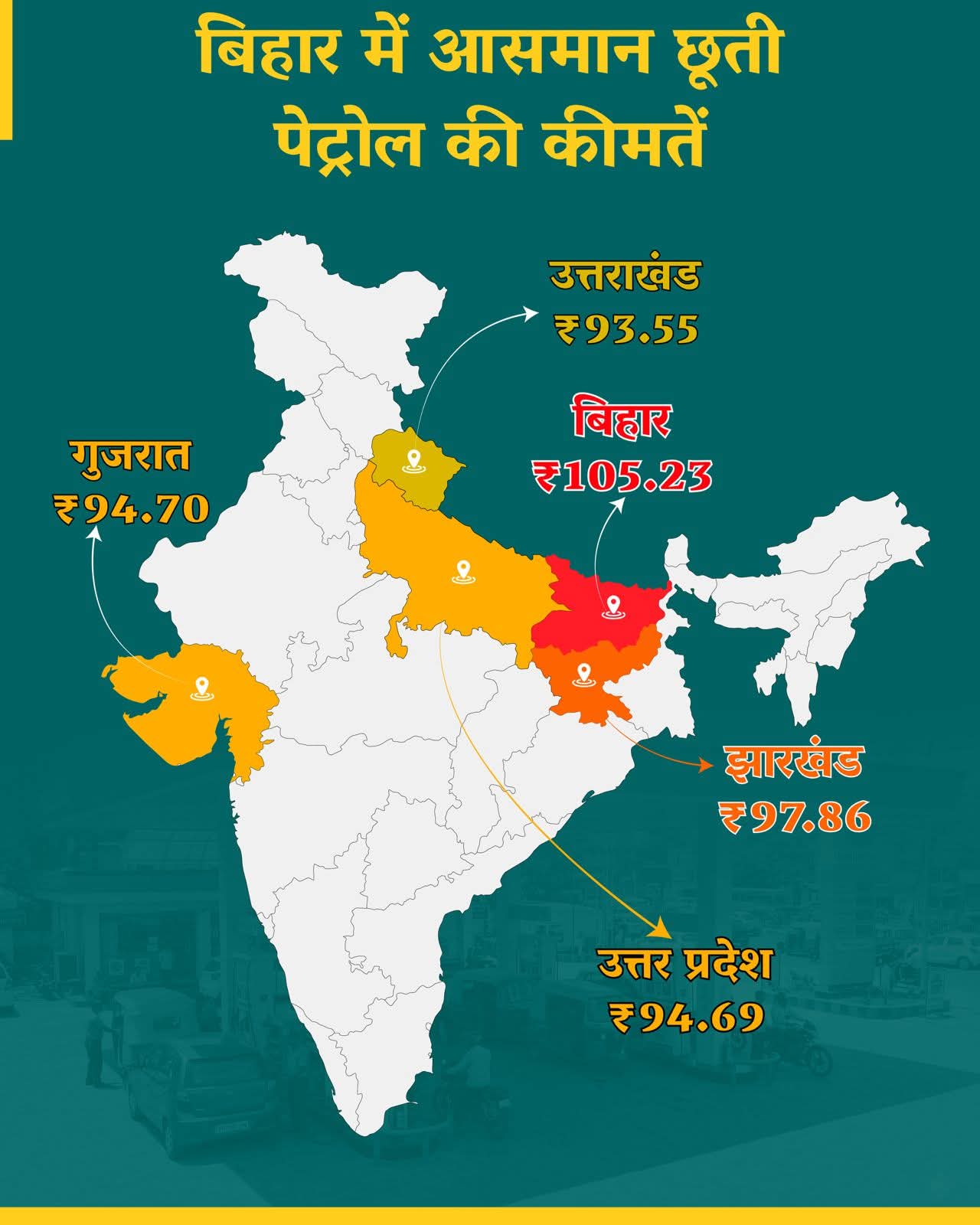 बिहार आज भारत देश के सबसे गरीब राज्यों में गिना जाता है। लेकिन इसी गरीब बिहार में पेट्रोल की कीमत ₹ 105.23 प्रति लीटर बिक रहा है । यानी देश के सबसे महंगे राज्यों में बिहार शामिल है। अब ज़रा तुलना करिए पेट्रोल दिल्ली ₹ 94.77, उत्तर प्रदेश ₹ 94.69,
