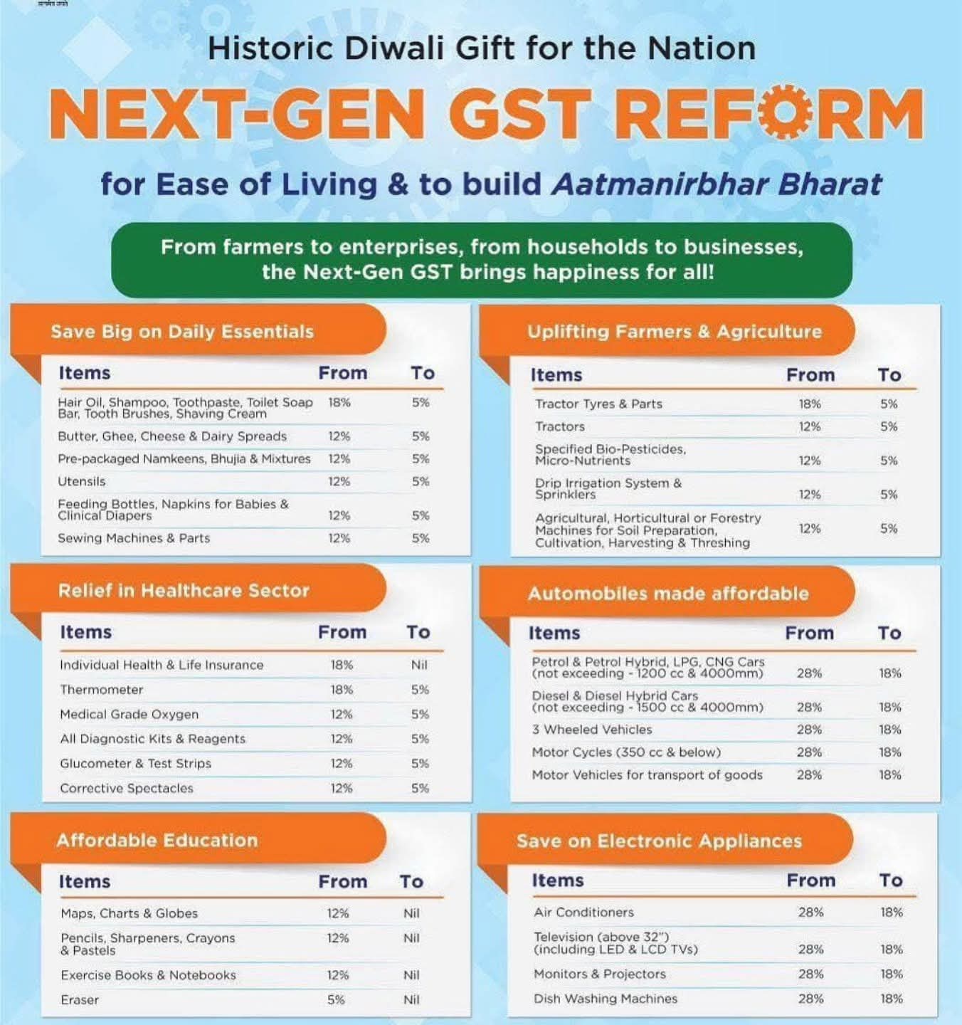 इसके साथ ही हेल्थ और लाइफ़ इंश्योरेंस सेवाओं पर से जीएसटी पूरी तरह हटा दिया गया है। कई आवश्यक वस्तुओं पर अब शून्य जीएसटी लगेगा, जिससे सीधे तौर पर आम लोगों की जेब पर बोझ कम होगा और अर्थव्यवस्था को नई गति मिलेगी।
