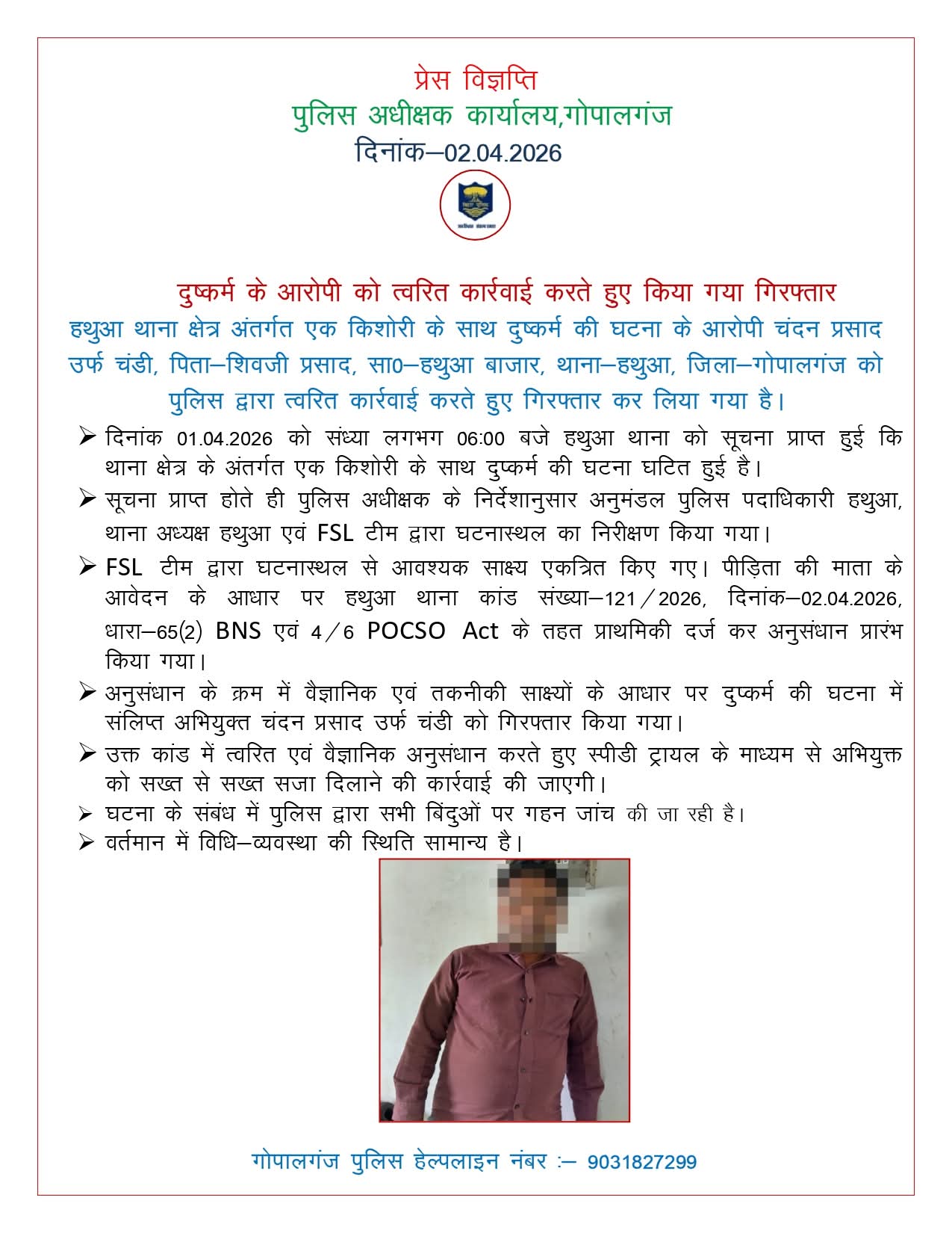 गोपालगंज।। बिहार के गोपालगंज जिले से एक रूह कपा देने वाली घटना सामने आई है, जहाँ मानवता को ताक पर रखकर एक 40 वर्षीय व्यक्ति ने मासूमियत को अपनी हवस का शिकार बनाया। हथुआ थाना क्षेत्र में एक 10 वर्षीय बच्ची के साथ पिछले तीन दिनों से पैसों का लालच देकर शारीरिक शोषण किए जाने का सनसनीखेज मामला प्रकाश में आया है। मिली जानकारी के अनुसार, आरोपी ने बच्ची को पैसों का प्रलोभन देकर अपने जाल में फंसाया और पिछले तीन दिनों से लगातार उसका यौन शोषण करता रहा। जब मामले की भनक परिजनों और स्थानीय लोगों को लगी, तो इलाके में हड़कंप मच गया। घटना की सूचना मिलते ही पुलिस महकमे में खलबली मच गई। मामले की गंभीरता को देखते हुए हथुआ थानाध्यक्ष शोयब आलम ने तत्परता दिखाई और त्वरित कार्रवाई करते हुए घेराबंदी कर 40 वर्षीय मुख्य आरोपी को गिरफ्तार कर लिया है। पुलिस ने आरोपी को हिरासत में लेकर पूछताछ शुरू कर दी है। पीड़ित बच्ची की स्थिति को देखते हुए पुलिस ने उसे तत्काल सदर अस्पताल, गोपालगंज भेज दिया है, जहाँ उसका मेडिकल परीक्षण कराया जा रहा है। थानाध्यक्ष ने बताया कि: