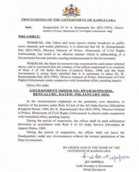 बेंगलुरु। कर्नाटक के वरिष्ठ आईपीएस अधिकारी एवं नागरिक अधिकार प्रवर्तन निदेशालय (डीसीआरई) के महानिदेशक (डीजीपी) रहे रामचंद्र राव के खिलाफ राज्य सरकार ने सख्त कार्रवाई करते हुए उन्हें निलंबित कर दिया है। यह कदम सोशल मीडिया पर उनके कथित आपत्तिजनक वीडियो वायरल होने के बाद उठाया गया, जिनमें वह अपने कार्यालय में एक महिला के साथ नजर आ रहे हैं। वीडियो सामने आते ही राज्य की राजनीति और प्रशासनिक हलकों में हलचल तेज हो गई। प्राप्त जानकारी के अनुसार, वायरल वीडियो में रामचंद्र राव को उनके कार्यालय कक्ष में एक महिला के साथ अंतरंग स्थिति में देखा गया है। एक वीडियो में वह पुलिस वर्दी में कुर्सी पर बैठे हुए महिला के साथ आपत्तिजनक आचरण करते दिखाई देते हैं, जबकि दूसरे वीडियो में वह सूट पहने हैं और कक्ष में भारतीय ध्वज तिरंगा तथा पुलिस विभाग का प्रतीक चिन्ह स्पष्ट रूप से नजर आता है। सूत्रों का दावा है कि ये फुटेज कार्यालय में लगे सीसीटीवी कैमरों के हो सकते हैं और करीब एक साल पुराने बताए जा रहे हैं। वीडियो सार्वजनिक होने के बाद कर्नाटक में तीखी प्रतिक्रियाएं देखने को मिलीं। विपक्ष ने सरकार से तत्काल कार्रवाई और निष्पक्ष जांच की मांग की, वहीं सत्तापक्ष ने मामले की गंभीरता को देखते हुए त्वरित कदम उठाने की बात कही। इसी क्रम में राज्य सरकार ने रामचंद्र राव को निलंबित कर दिया। हालांकि, रामचंद्र राव ने अपने ऊपर लगे सभी आरोपों को सिरे से खारिज किया है। गृह मंत्री जी. परमेश्वर से मुलाकात के लिए उनके आवास पहुंचे राव की मुलाकात नहीं हो सकी। बाद में मीडिया से बातचीत में उन्होंने कहा, “ये पूरी तरह से मनगढ़ंत है। मुझे बदनाम करने की साजिश के तहत फर्जी वीडियो फैलाए जा रहे हैं।” उन्होंने निष्पक्ष जांच की मांग करते हुए खुद को निर्दोष बताया। सूत्रों के मुताबिक, वायरल वीडियो उस अवधि के बताए जा रहे हैं, जो फिल्म अभिनेत्री रान्या राव की सोना तस्करी मामले में गिरफ्तारी से पहले की है। यह भी स्पष्ट नहीं हो पाया है कि कथित पुराने वीडियो इस समय ही क्यों सार्वजनिक किए गए। इस बिंदु पर भी जांच की संभावना जताई जा रही है कि फुटेज को किसने और किस उद्देश्य से लीक किया। उल्लेखनीय है कि रामचंद्र राव पहली बार विवादों में नहीं हैं। वह जेल में बंद अभिनेत्री रान्या राव के सौतेले पिता हैं। रान्या को मार्च 2025 में सोना तस्करी के आरोप में गिरफ्तार किया गया था। आरोप है कि उन्होंने अपने पिता के पद और प्रोटोकॉल का दुरुपयोग कर कथित तौर पर अवैध गतिविधियों को अंजाम दिया। हालांकि, इन आरोपों पर भी न्यायिक प्रक्रिया जारी है। राज्य सरकार ने संकेत दिए हैं कि मामले की निष्पक्ष और विस्तृत जांच कराई जाएगी, ताकि सच्चाई सामने आ सके और यदि किसी स्त