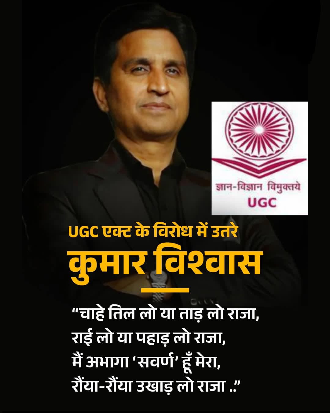 ​कुमार विश्वास ने UGC के नए मसौदे के खिलाफ अपनी आवाज उठाई है। उन्होंने अपनी चिर-परिचित शैली में कविता की पंक्तियों के माध्यम से सरकार और व्यवस्था पर कटाक्ष किया है। UGC के उस मसौदे का विरोध हो रहा था जिसमें यह सुझाव दिया गया था कि यदि उपयुक्त आरक्षित श्रेणी (SC/ST/OBC) के उम्मीदवार नहीं मिलते हैं, तो उन पदों को अनारक्षित श्रेणी में बदला जा सकता है। पोस्टर में उनके द्वारा कही गई पंक्तियाँ व्यवस्था के प्रति उनके तीखे विरोध को दर्शाती हैं।