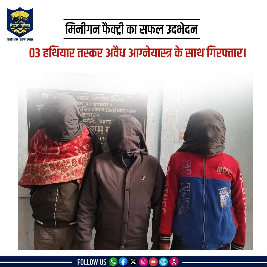 मुंगेर। बिहार पुलिस की स्पेशल टास्क फोर्स (STF) और मुंगेर जिला पुलिस की संयुक्त कार्रवाई में अवैध हथियार निर्माण के एक बड़े नेटवर्क का पर्दाफाश किया गया है। दिनांक 24 दिसंबर 2025 को मुफस्सिल थाना क्षेत्र अंतर्गत गंगा नदी के तारापुर दियारा में छापेमारी कर एक सक्रिय मिनीगन फैक्ट्री का सफल उद्भेदन किया गया। इस दौरान हथियार बनाने में संलिप्त तीन शातिर तस्करों/कारिगरों को अवैध आग्नेयास्त्रों और हथियार निर्माण में प्रयुक्त उपकरणों के साथ गिरफ्तार किया गया।