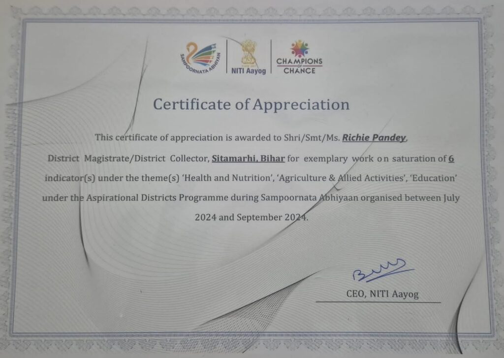 नीति आयोग (भारत सरकार) द्वारा आकांक्षी जिला और आकांक्षी प्रखण्ड कार्यक्रम अन्तर्गत “संपूर्णता अभियान” में संतृप्तता को लेकर जिला पदाधिकारी सीतामढ़ी और प्रखण्ड विकास पदाधिकारी बैरगनिया को किया गया सम्मानित।