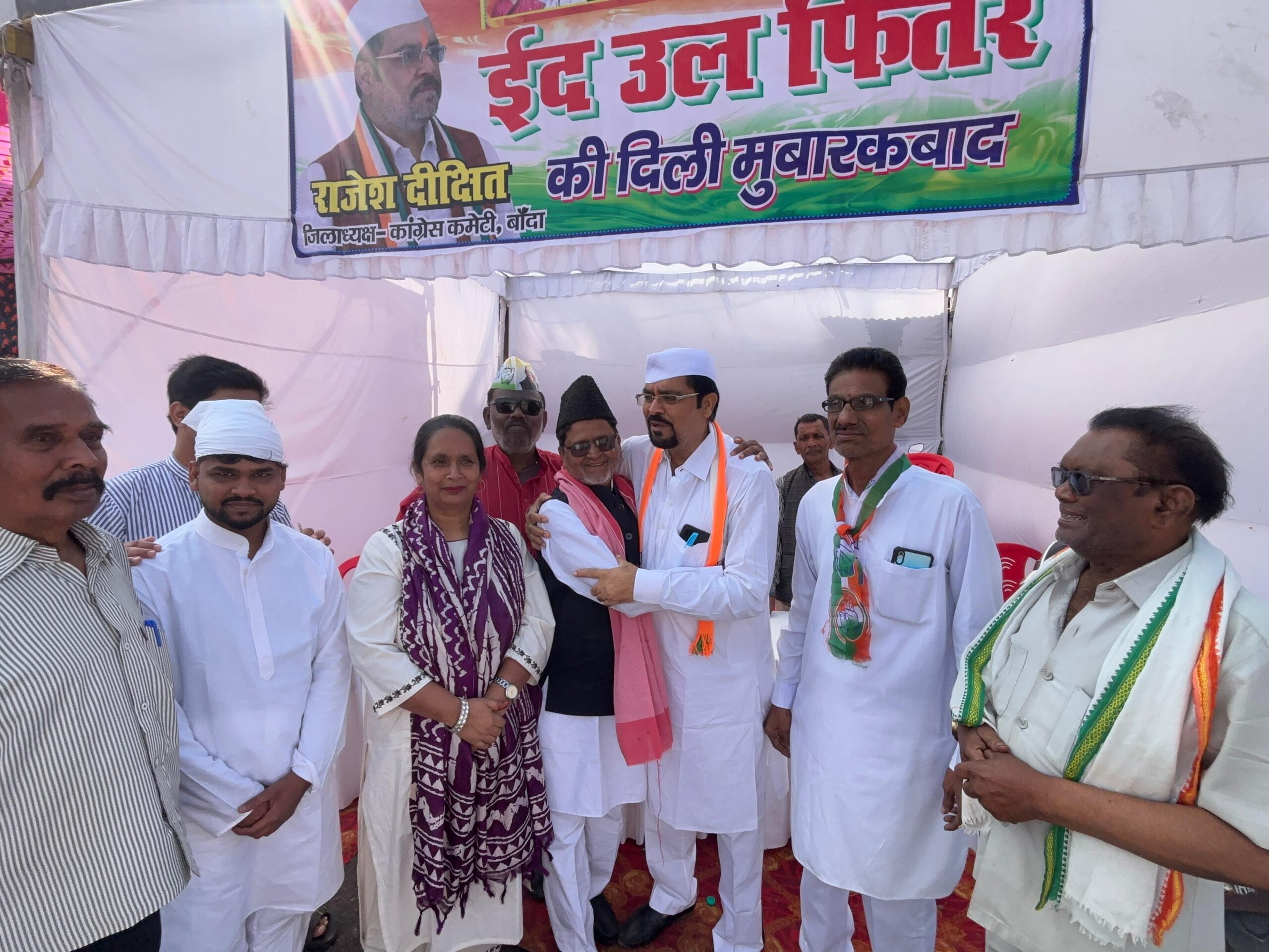 बांदा। ईद-उल-फितर के पावन अवसर पर जिले में आपसी सौहार्द और भाईचारे की शानदार तस्वीर देखने को मिली। कांग्रेस जिला अध्यक्ष राजेश दीक्षित के नेतृत्व में बाबूलाल चौराहा स्थित ईदगाह के पास लगाए गए पंडाल में लोगों ने एक-दूसरे को गले लगाकर ईद की मुबारकबाद दी और अमन-चैन की दुआ की।