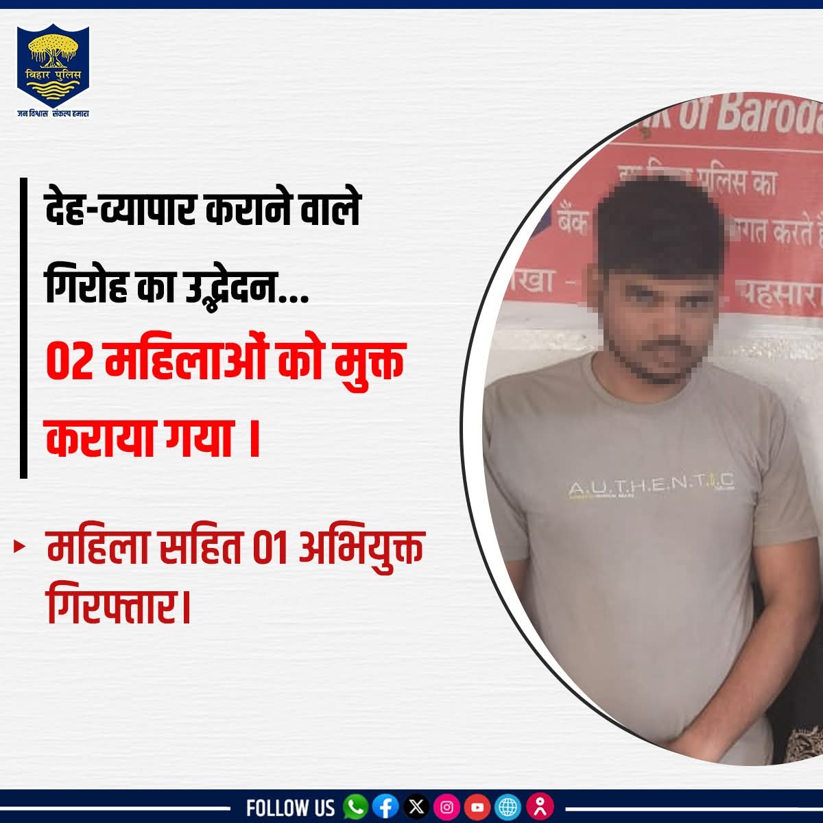 बेगूसराय जिले के बखरी थानान्तर्गत दिनांक 02.12.25 की रात में मिली गुप्त सूचना के आधार पर जिला पुलिस द्वारा त्वरित कार्रवाई करते हुए महिलाओं को अपहरण कर देह-व्यापार के लिए मजबूर कराने वाले गिरोह का उद्भेदन किया गया है। इस कार्रवाई में पुलिस ने 2 अभियुक्तों को गिरफ्तार किया है और 2 महिलाओं को मुक्त कराया है।