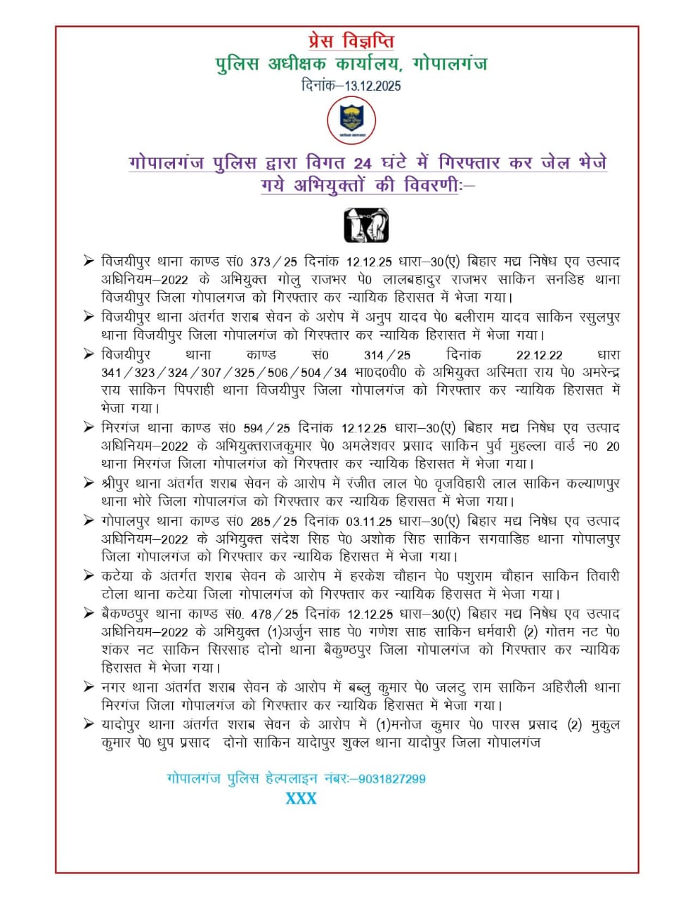 गोपालगंज पुलिस का सख़्त एक्शन: 24 घंटे में दर्जनभर अभियुक्त गिरफ्तार, सभी भेजे गए जेल