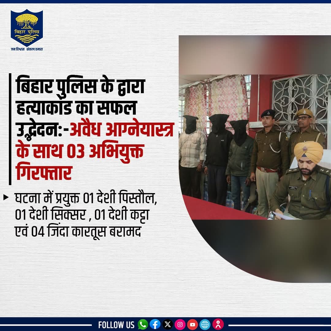 दिनांक 25.11.2025 को तीनों आरोपियों ने हनुमान मंदिर के पास 14 राउंड फायरिंग कर हत्या को अंजाम देने की बात स्वीकार की। गुड्डू कुमार के स्वीकारोक्ति बयान के आधार पर प्रिंस कुमार तथा मनीष कुमार को गिरफ्तार किया गया। मनीष कुमार की तलाशी में घटना में प्रयुक्त 01 देशी पिस्तौल, 01 देशी सिक्सर, 01 देशी कट्टा एवं 04 जिंदा कारतूस बरामद हुआ।