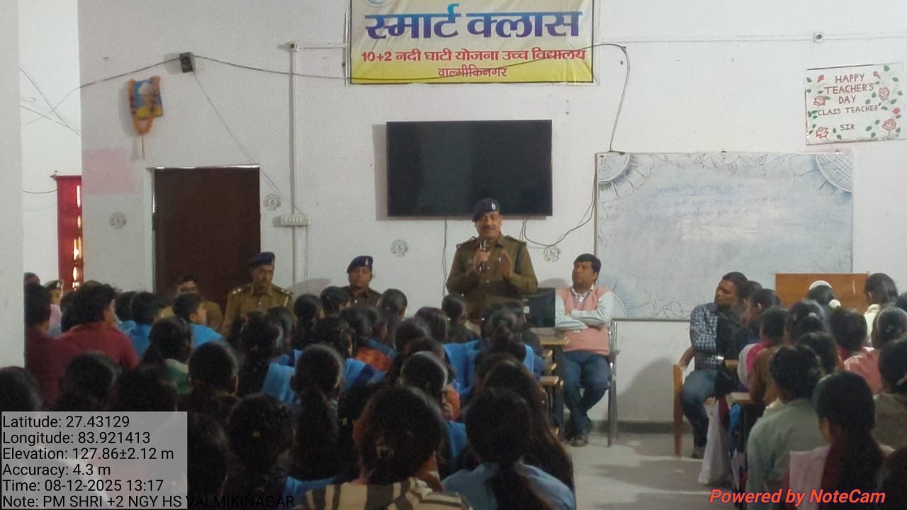 वाल्मीकि नगर स्थित +2 नदी घाटी योजना उच्च विद्यालय के स्मार्ट क्लास में वाल्मीकि नगर थाना के इंस्पेक्टर सह थानाध्यक्ष मुकेश चन्द्र कुमर एवं थाने के सब इंस्पेक्टर सरिता कुमारी द्वारा विद्यालय के स्मार्ट क्लास के सभागार में सोमवार की दोपहर विद्यालय के सभी छात्र- छात्राओं व शिक्षक गण के समक्ष बच्चियों के सुरक्षा के लिए कई तरह के उपाय व 112 नंबर के महत्व के बारे में विस्तृत रूप से जानकारी दी।आजकल ए.आई एप्लीकेशन (सॉफ्टवेयर) से फ्रॉड व सोशल मीडिया के माध्यम से ब्लैक मेलिंग, स्कैम व साइबर फ्रॉड की स्थिति में या किसी लड़की के फोटो या वीडियो सोशल मीडिया पर अपलोड करने की स्थिति में तत्काल इसकी सूचना 1930 पर दे। ऐसे कई तरह के होने वाले अपराध से अपने बचाव को लेकर अवगत कराया। थाना अध्यक्ष के विद्यालय पहुंचने पर छात्र-छात्राओं ने भारत माता की जय घोष से भव्य स्वागत किया।प्रधानाध्यापक राकेश कुमार राव ने भी सभी छात्र-छात्राओं को इन सभी बुराईयों से दूर व सजग रहने की सलाह दी। बच्चियों ने भी इस संबंध में समझकर अपने विचार को खुलकर व्यक्त किया। थानाध्यक्ष ने खासकर छात्र-छात्राओं को महिला सशक्तिकरण के विषय पर चर्चा की।और कार्यक्रम के अंत में प्रधानाध्यापक ने उपस्थित थानाध्यक्ष महोदय व उनके साथ आए सहकर्मियों को धन्यवाद दिया। वही विद्यालय के छात्र-छात्राओं ने राष्ट्रीय गान गाकर थानाध्यक्ष को सम्मानित किया।इस कार्यक्रम में विद्यालय के प्रधानाध्यापक राकेश कुमार राव, प्रधान शिक्षक मनोज कुमार,शिक्षक मोफिल देव पासवान, बिपिन कुमार, विजय कुमार,संजीत कुमार, धीरज कुमार,चन्दन, सत्यनारायण, सुभाष, मुन्ना कुमार, पवन कुमार, मो. सगीर, ऋषभ,संजय, आशुतोष कुमार ,बलजीत,मुन्ना कुमार राम, ओमप्रकाश, शिक्षिका तृप्ति कुमारी, भगवती कुमारी, मिन्नत प्रवीन आदि शिक्षक व छात्र-छात्राएं उपस्थित रहे |