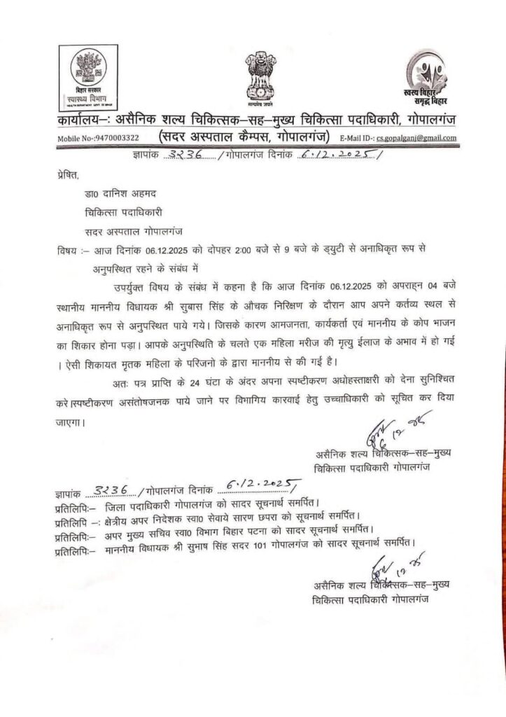 6 दिसंबर को ड्यूटी पर तैनात डॉ. दानिश अहमद अनुपस्थित पाए गए, जिससे एक गंभीर बीमार महिला की मौत हो गई। अस्पताल प्रशासन ने डॉक्टर से 24 घंटे के भीतर स्पष्टीकरण मांगा है।