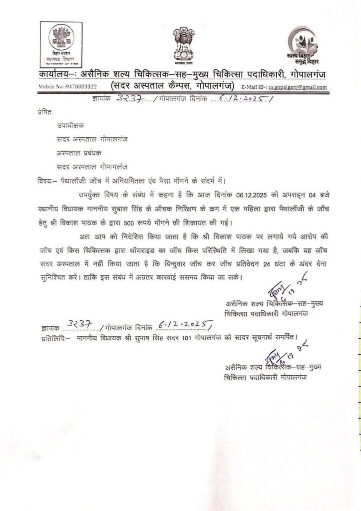गोपालगंज, 7 दिसंबर 2025 – गोपालगंज सदर अस्पताल में लापरवाही और अवैध वसूली के दो गंभीर मामले सामने आए हैं। विधायक सुभाष सिंह के औचक निरीक्षण में ड्यूटी से गायब डॉक्टर और जांच के नाम पर पैसे वसूलने वाले कर्मचारी का खुलासा हुआ है।