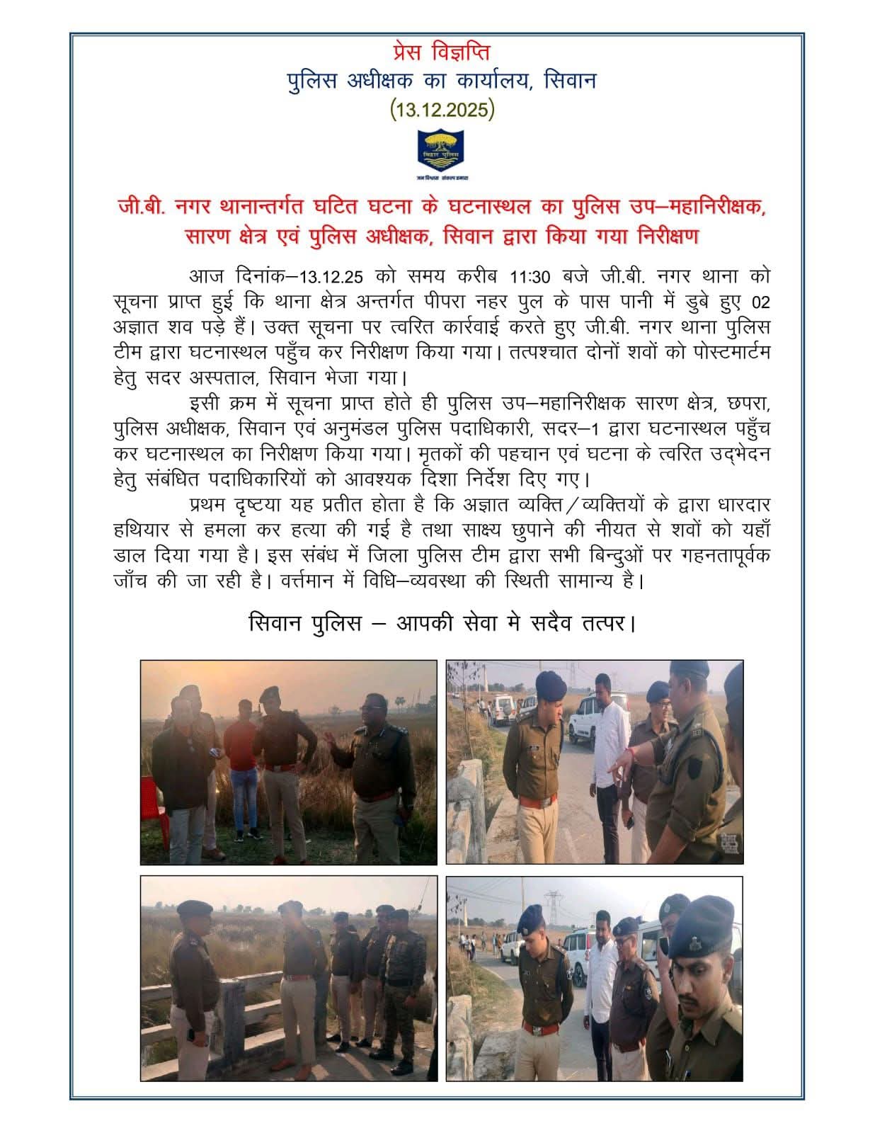 प्राप्त जानकारी के अनुसार, करीब 11:30 बजे स्थानीय लोगों से सूचना मिलते ही जी.बी. नगर थाना पुलिस टीम तत्काल मौके पर पहुंची और घटनास्थल का निरीक्षण किया। दोनों शवों को नहर से बाहर निकालकर पोस्टमार्टम के लिए सदर अस्पताल, सिवान भेज दिया गया है।
