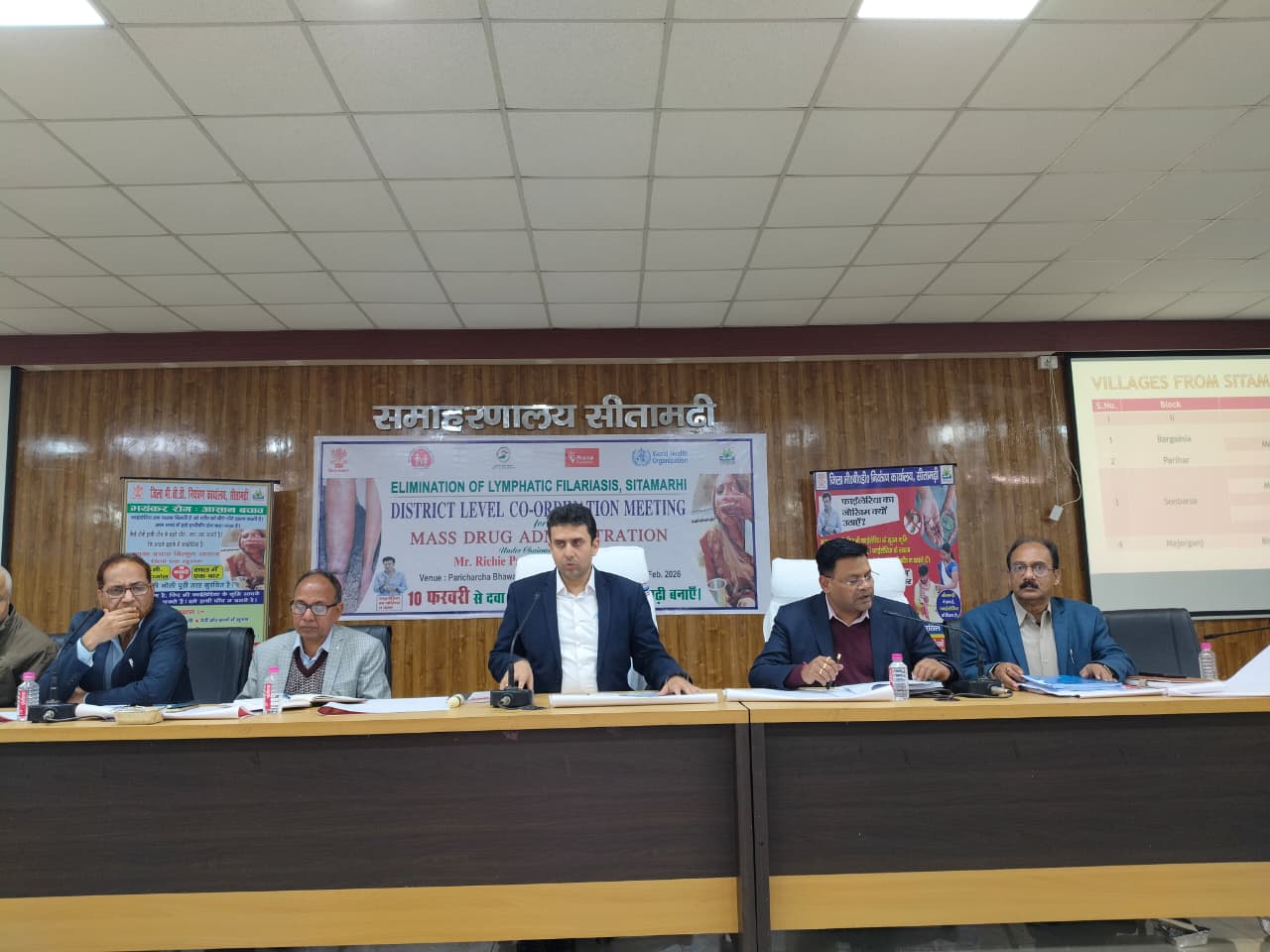 सीतामढ़ी जिले में फाइलेरिया नियंत्रण के उद्देश्य से आगामी 10 फरवरी 2026 से शुरू होने वाले “सर्वजन दवा सेवन कार्यक्रम” को लेकर जिला पदाधिकारी रिची पाण्डेय की अध्यक्षता में अध्यक्षता में कल देर शाम परिचर्चा भवन में समन्यव समिति की बैठक आयोजित की गई। बैठक में जिले के विभिन्न विभागों के पदाधिकारी एवं सहयोगी संस्थाओं के प्रतिनिधि उपस्थित रहे।