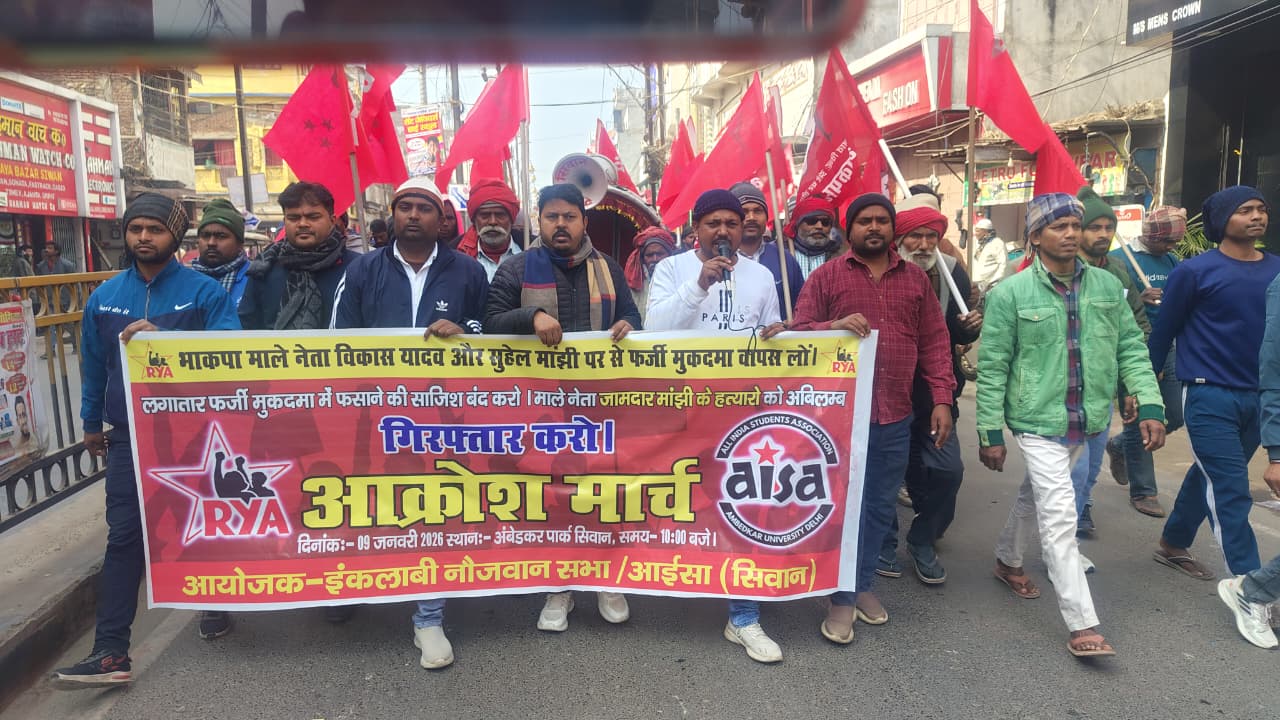 आज दिनांक 09 जनवरी 2026 को सिवान बाबा साहब डॉ भीम राव आंबेडकर पार्क से माले नेता विकास यादव और सोहेल मांझी पर से फर्जी मुकदमा वापस लो , जमादार मांझी के हत्यारों को गिरफ्तार करो के नारे के साथ आक्रोश मार्च निकाल गया।