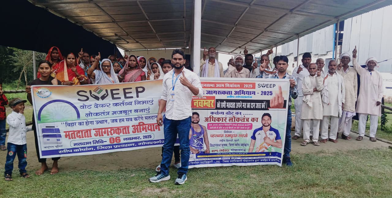 बिहार विधानसभा निर्वाचन 2025 के पहले चरण को लेकर मतदाता जागरूकता अभियान लगातार जारी है। इसी क्रम में रविवार को 103 भोरे विधानसभा क्षेत्र के लामीचौर और डोमनपुर पंचायत में जिला स्वीप आइकॉन व राष्ट्रीय पहलवान रामपूजन साहनी के नेतृत्व में जागरूकता कार्यक्रम आयोजित किया गया।